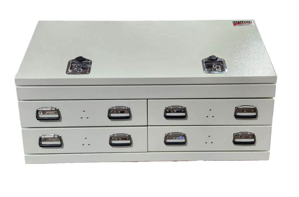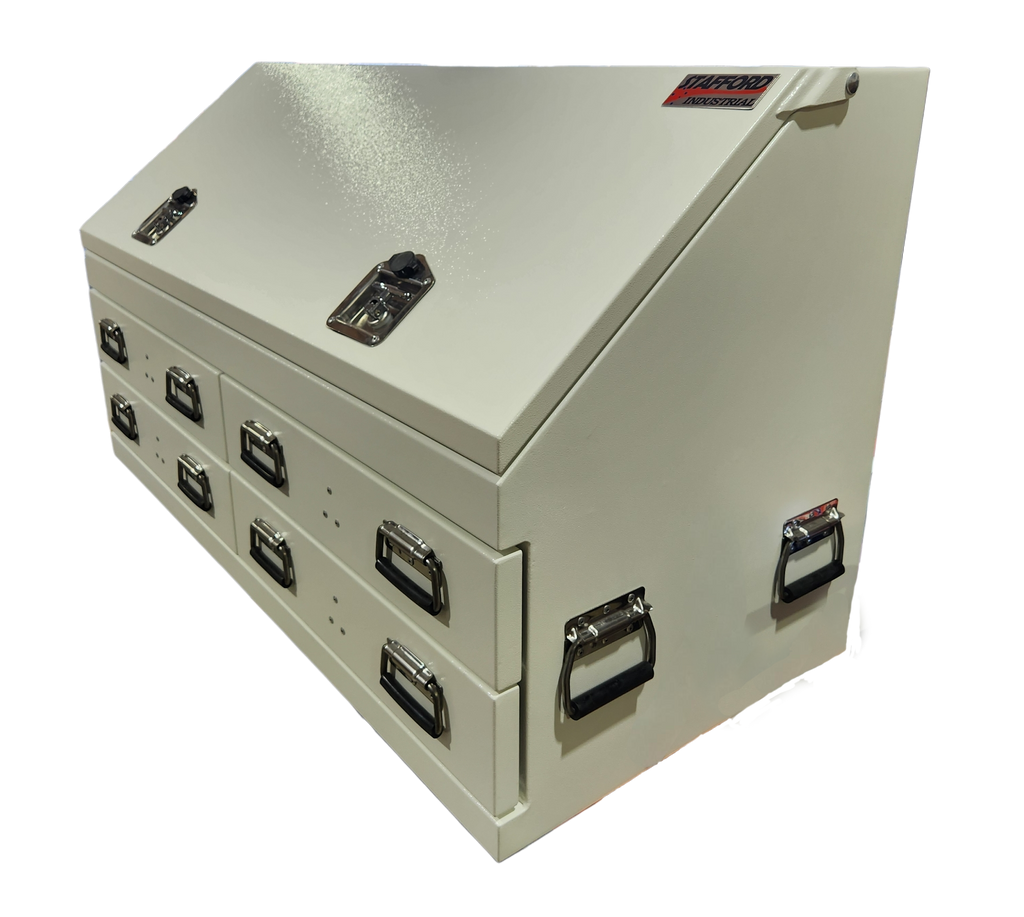 The Stafford 1300mm Four Drawer Angled Ute Box is a heavy duty gauge steel fabricated tool box. Water proof and lockable, this tool box is made to combat the harsh environments of living on the back of your Ute. With 1.8mm thick walls, four drawers, two storage shelfs, gas struts and a powder coated finish this large storage space is the tradesman’s best mate.