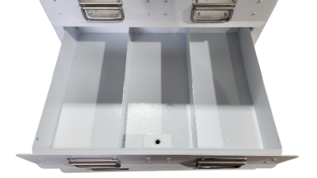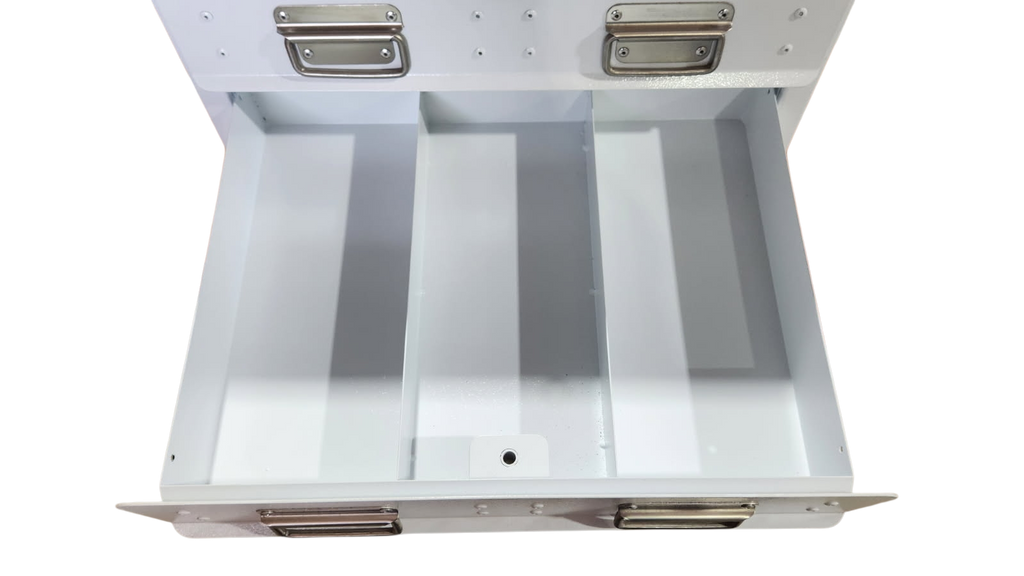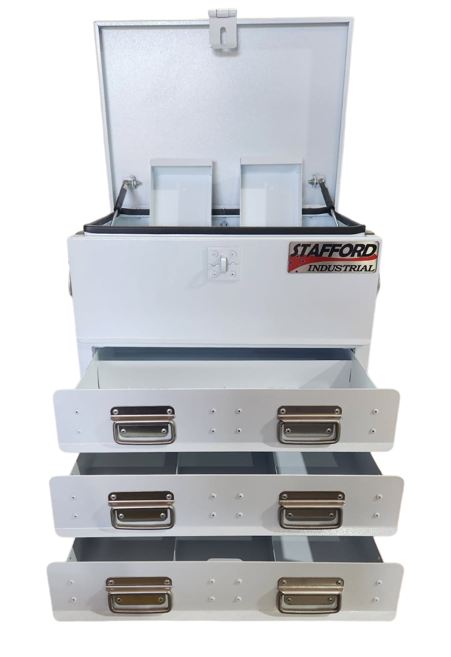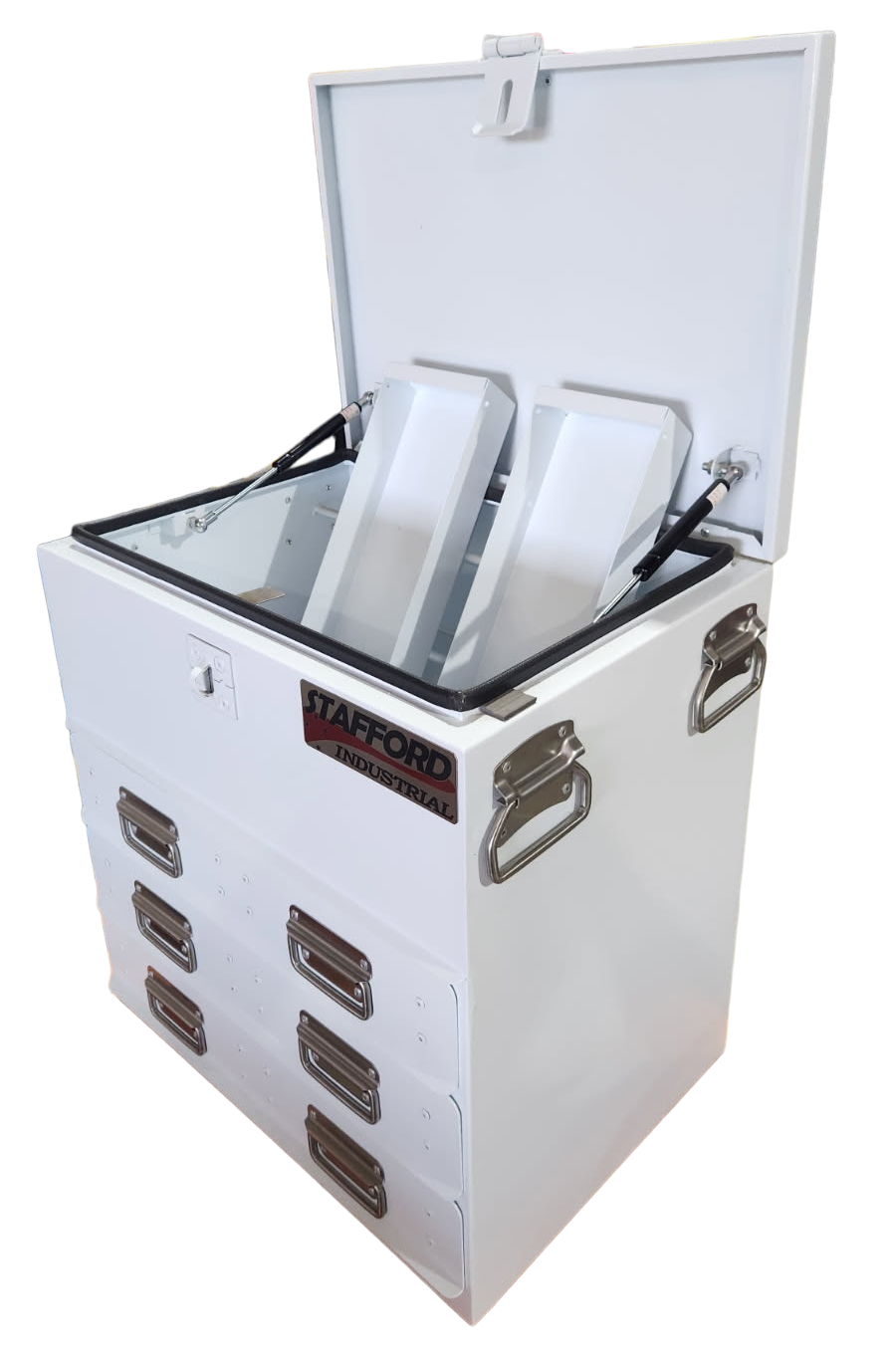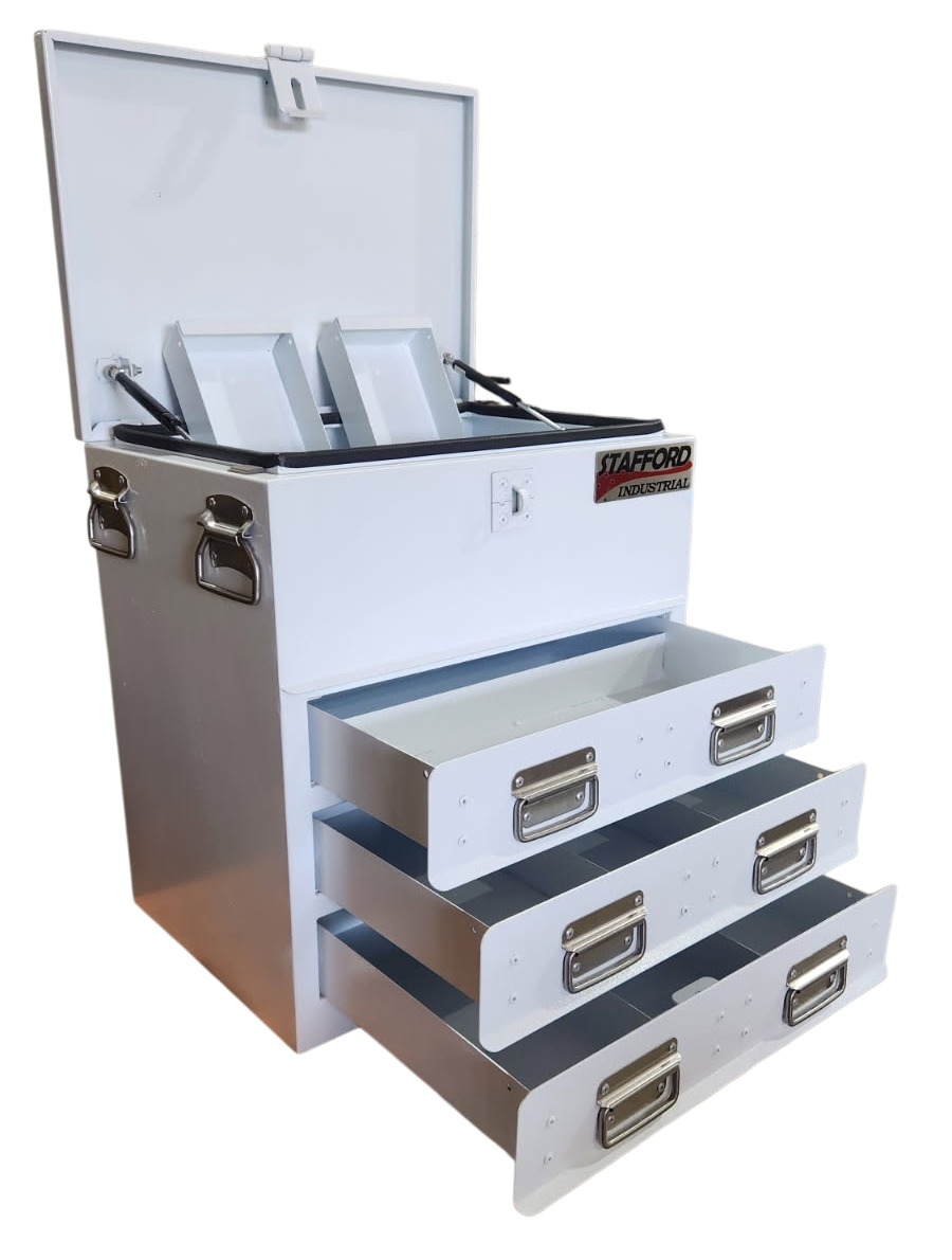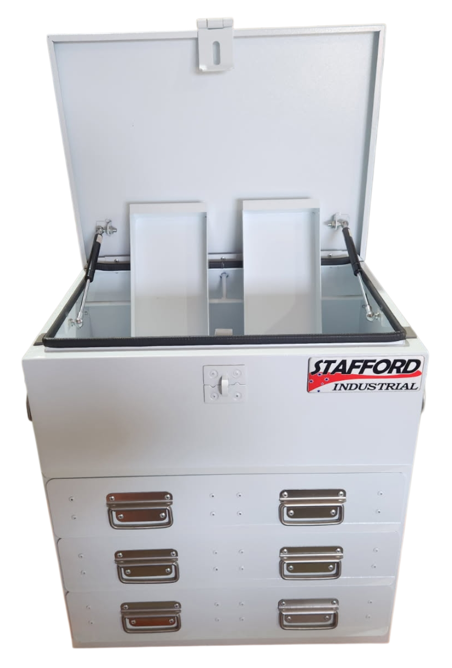 The Stafford Three Drawers Ute Box is a heavy duty gauge steel fabricated tool box. Water proof and lockable, this tool box is made to combat the harsh environments of living on the back of your Ute. With 1.5mm thick walls, four drawers, two lift out top trays, gas struts and a powder coated finish this large storage space is the tradesman’s best mate.