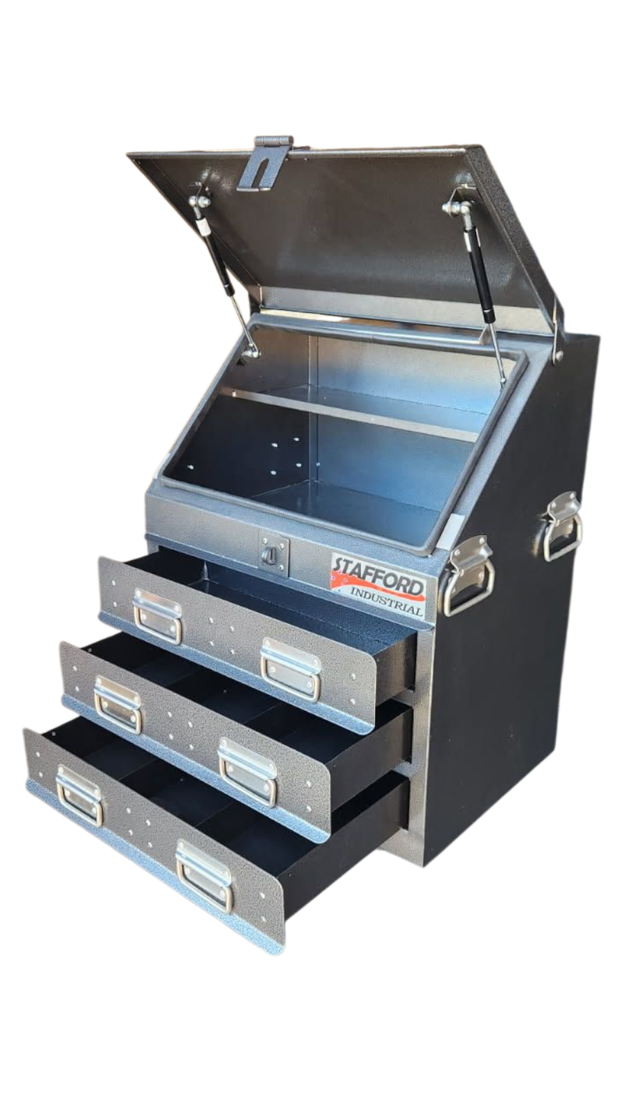 The Stafford Three Drawer Ute Box is a heavy duty gauge steel fabricated tool box. Water proof and lockable, this tool box is made to combat the harsh environments of living on the back of your Ute. With 1.5mm thick walls, four drawers, gas struts and a powder coated finish this large storage space is the tradesman’s best mate.