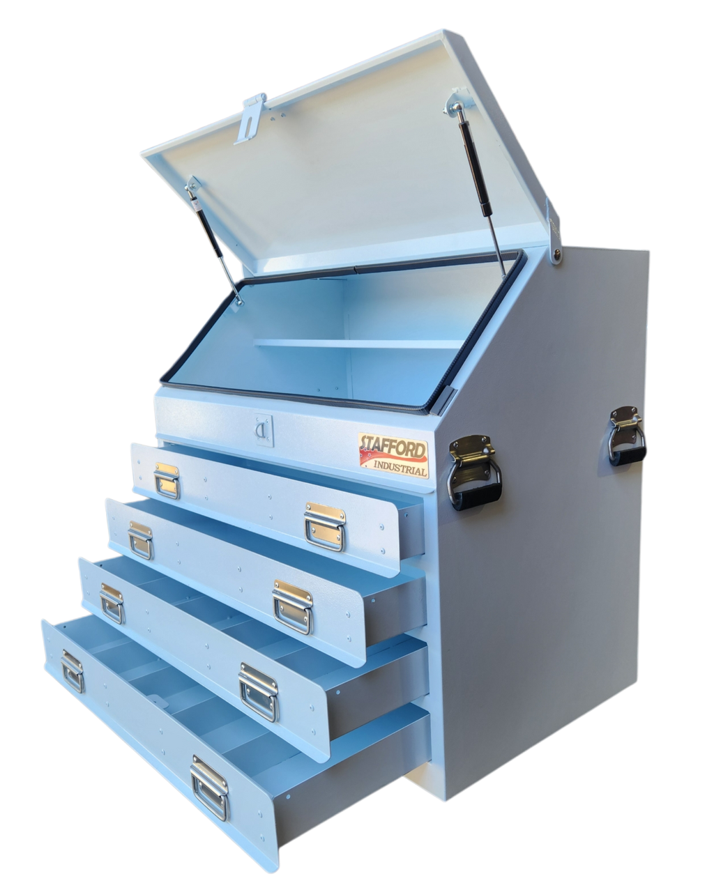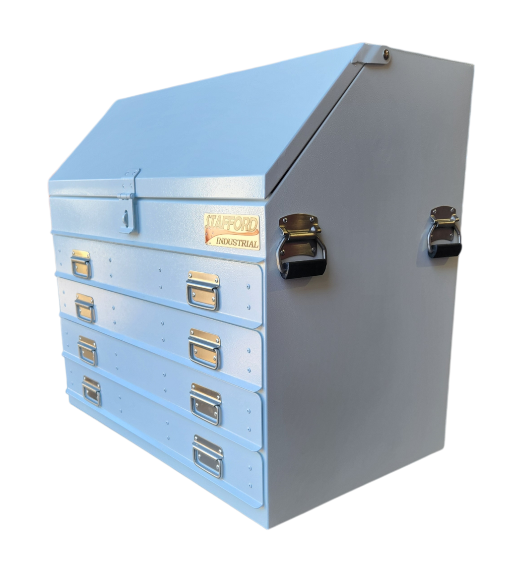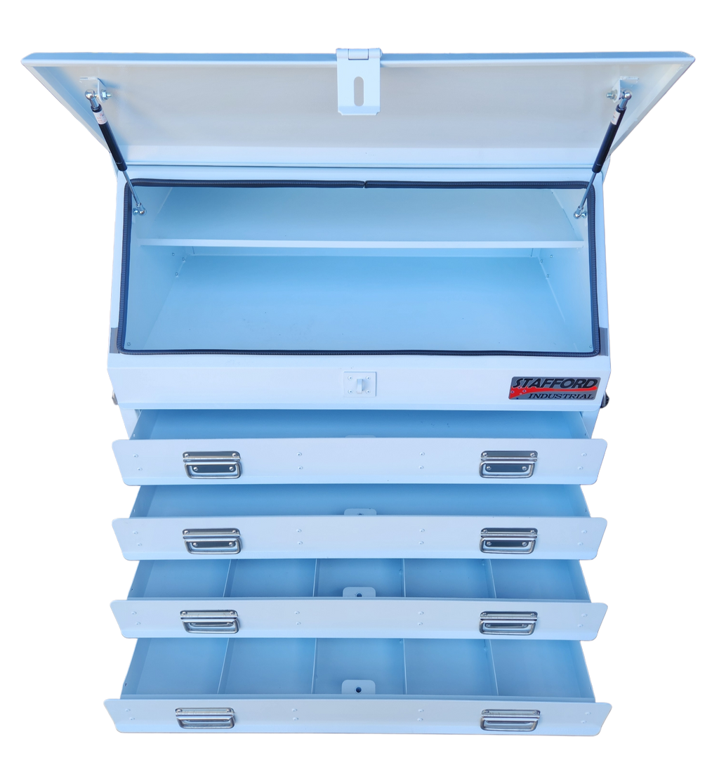 The Stafford Four Drawer Angled Truck Tool Box is a heavy duty gauge steel fabricated tool box. Water proof and lockable, this tool box is made to combat the harsh environments of living on the back of your truck. With 1.5mm thick walls, four drawers, gas struts and a powder coated finish this large storage space is the tradesman’s best mate.