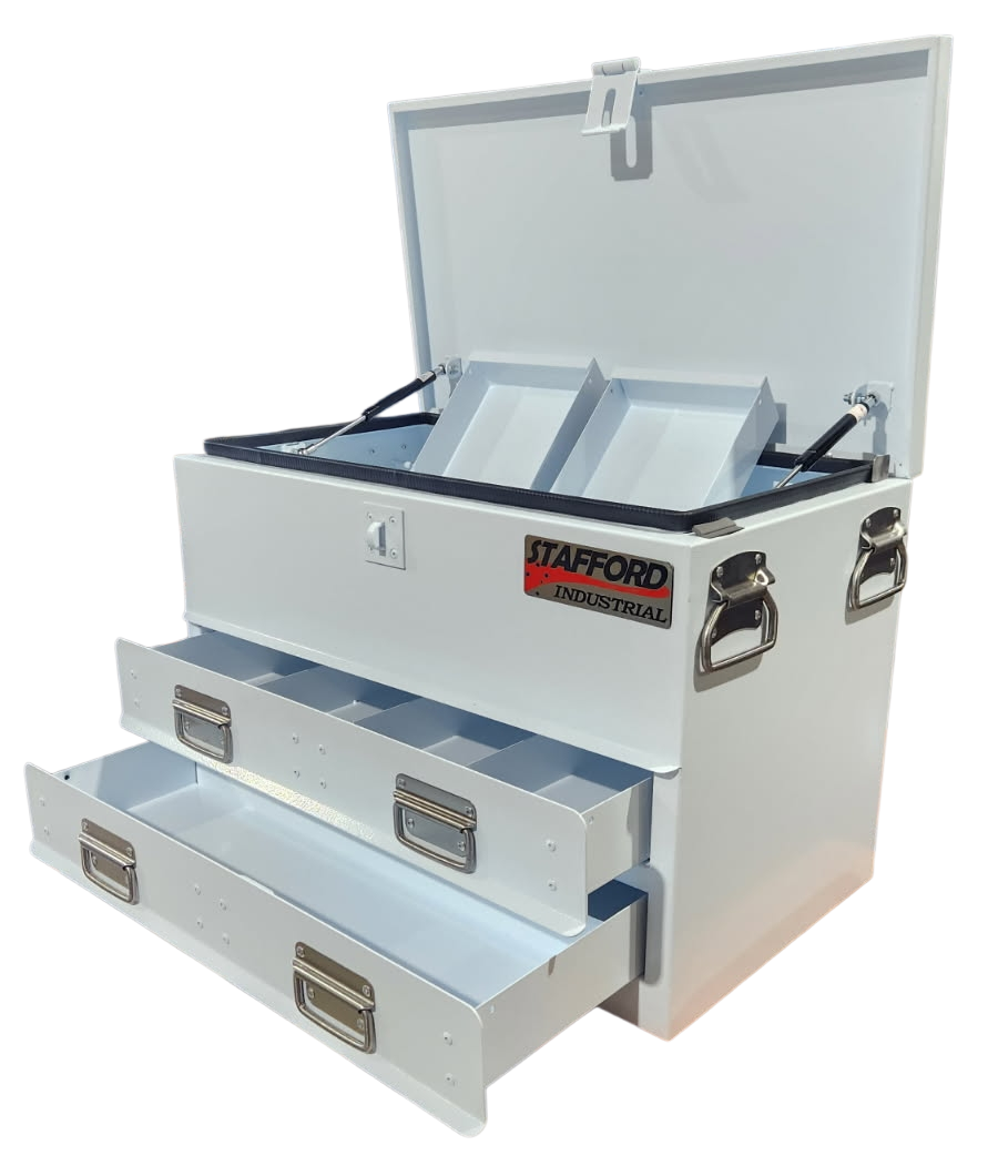 The Stafford Two Drawer Ute Box is a heavy duty gauge steel fabricated tool box. Water proof and lockable, this tool box is made to combat the harsh environments of living on the back of your Ute. With 1.5mm thick walls, two drawers, two lift out top trays, gas struts and a powder coated finish this large storage space is the tradesman’s best mate.