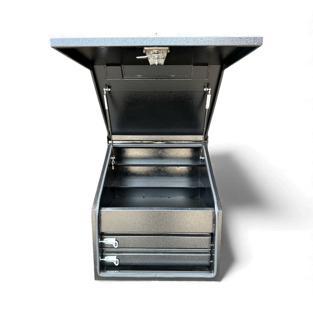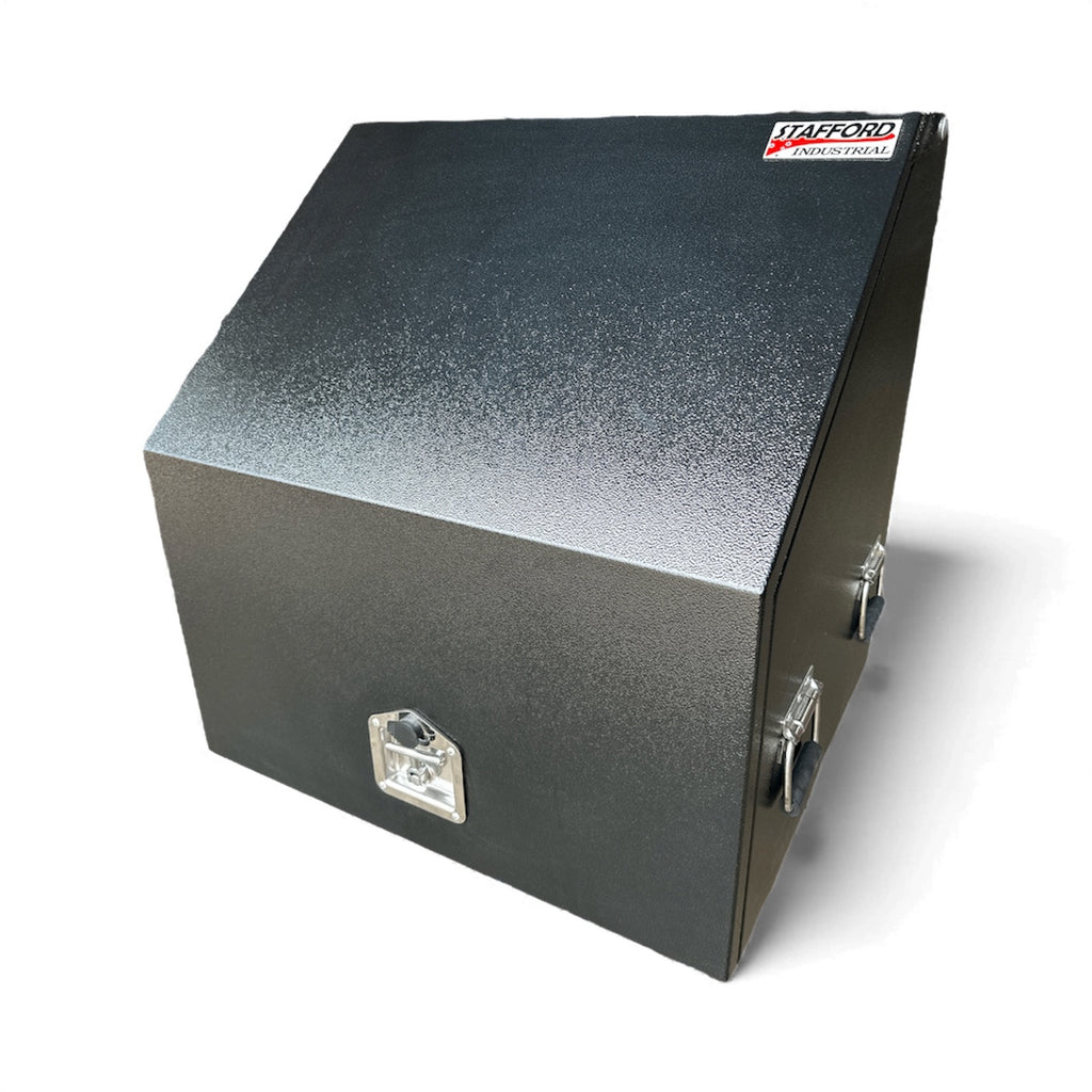 The Stafford 700mm Two Drawer Full Front Angled Ute Box is a heavy duty gauge steel fabricated tool box. Water proof and lockable, this tool box is made to combat the harsh environments of living on the back of your Ute. With 1.8mm thick walls, two drawers, two shelves, gas struts and a powder coated finish this storage space is the tradesman’s best mate.