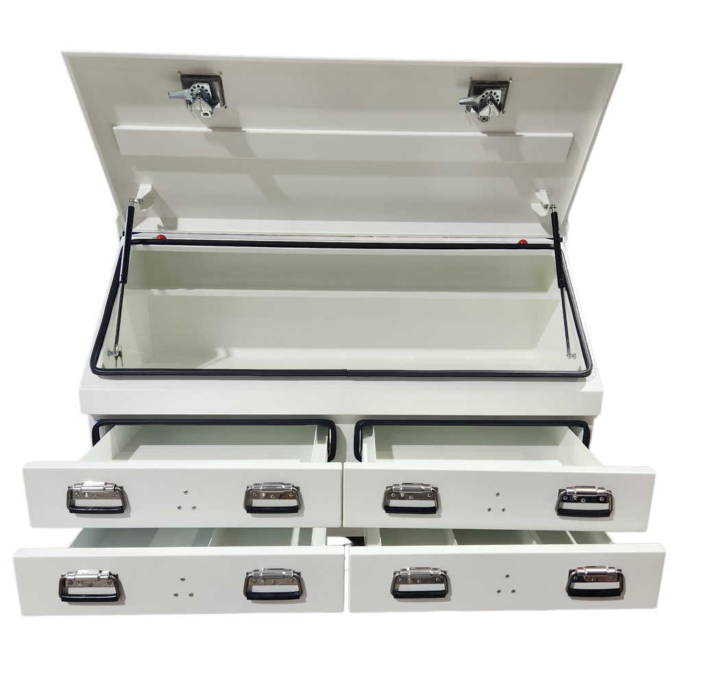 The Stafford 1300mm Four Drawer Angled Ute Box is a heavy duty gauge steel fabricated tool box. Water proof and lockable, this tool box is made to combat the harsh environments of living on the back of your Ute. With 1.8mm thick walls, four drawers, two storage shelfs, gas struts and a powder coated finish this large storage space is the tradesman’s best mate.