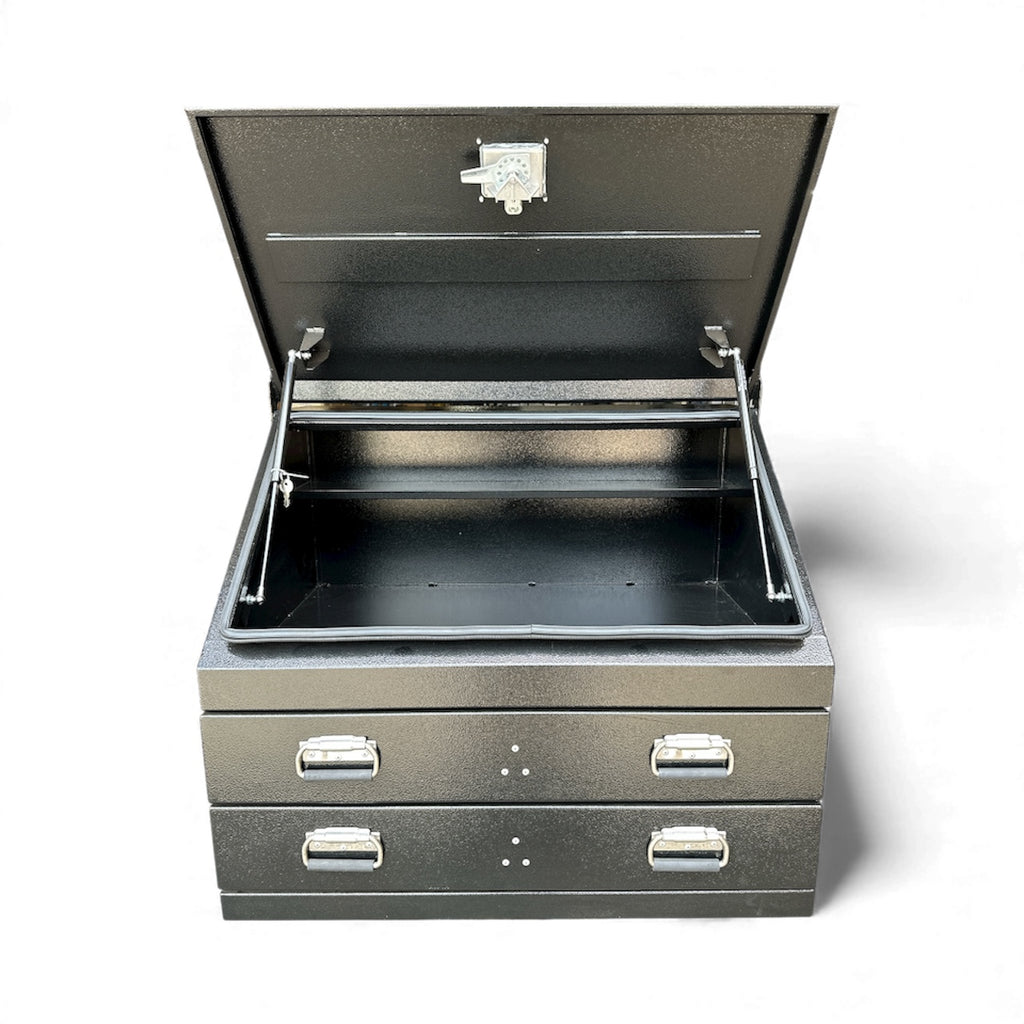 The Stafford 900mm 2 Drawer Angled Ute Box is a heavy duty gauge steel fabricated tool box with fully welded seams Water proof and lockable, this tool box is made to combat the harsh environments of living on the back of your Ute. With 1.8mm thick walls, four drawers, two storage shelfs, gas struts and a powder coated finish this large storage space is the tradesman’s best mate.